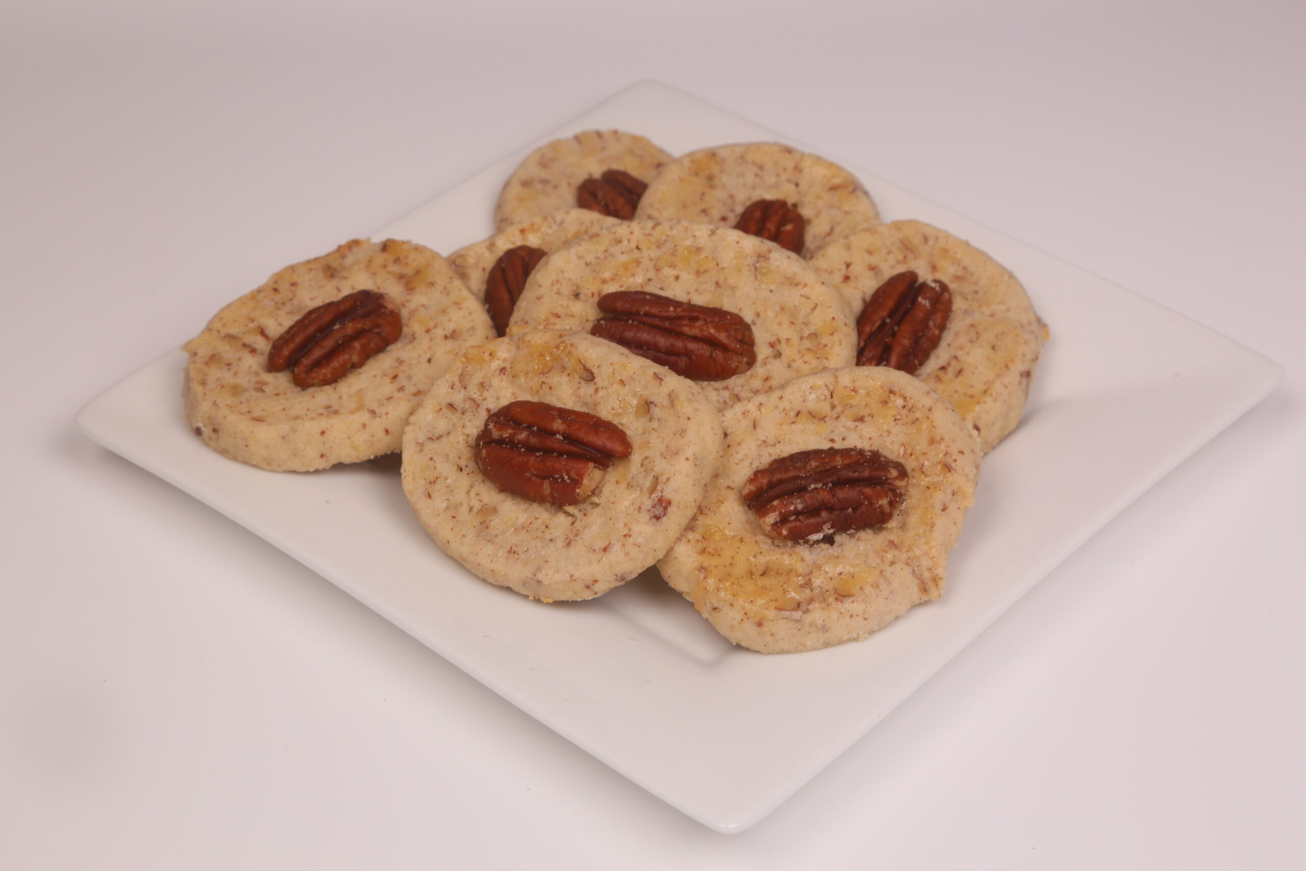 Cut into ¼” slices and place on parchment lined sheets. Brush egg wash on top of cookies. Place pecan halves in center of each. Bake 8-10 minutes until very lightly browned.