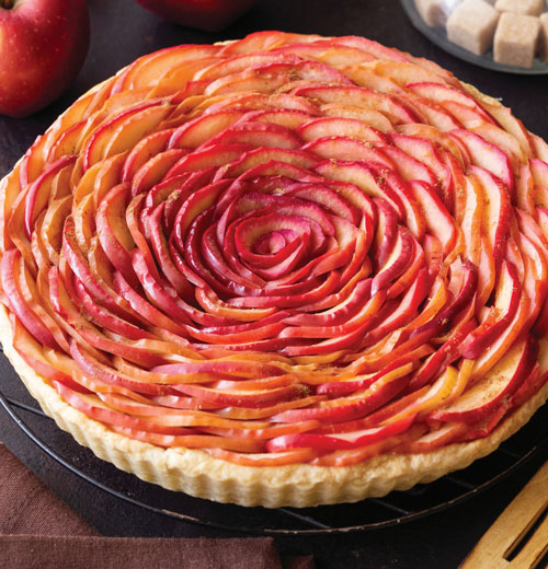 This showstopper is simpler than it looks. Once the crust is made and baked, you can focus on the fun part: making the beautiful rose pattern. Careful, even cutting will yield the most picture-perfect results. Makes one 10″ round tart.