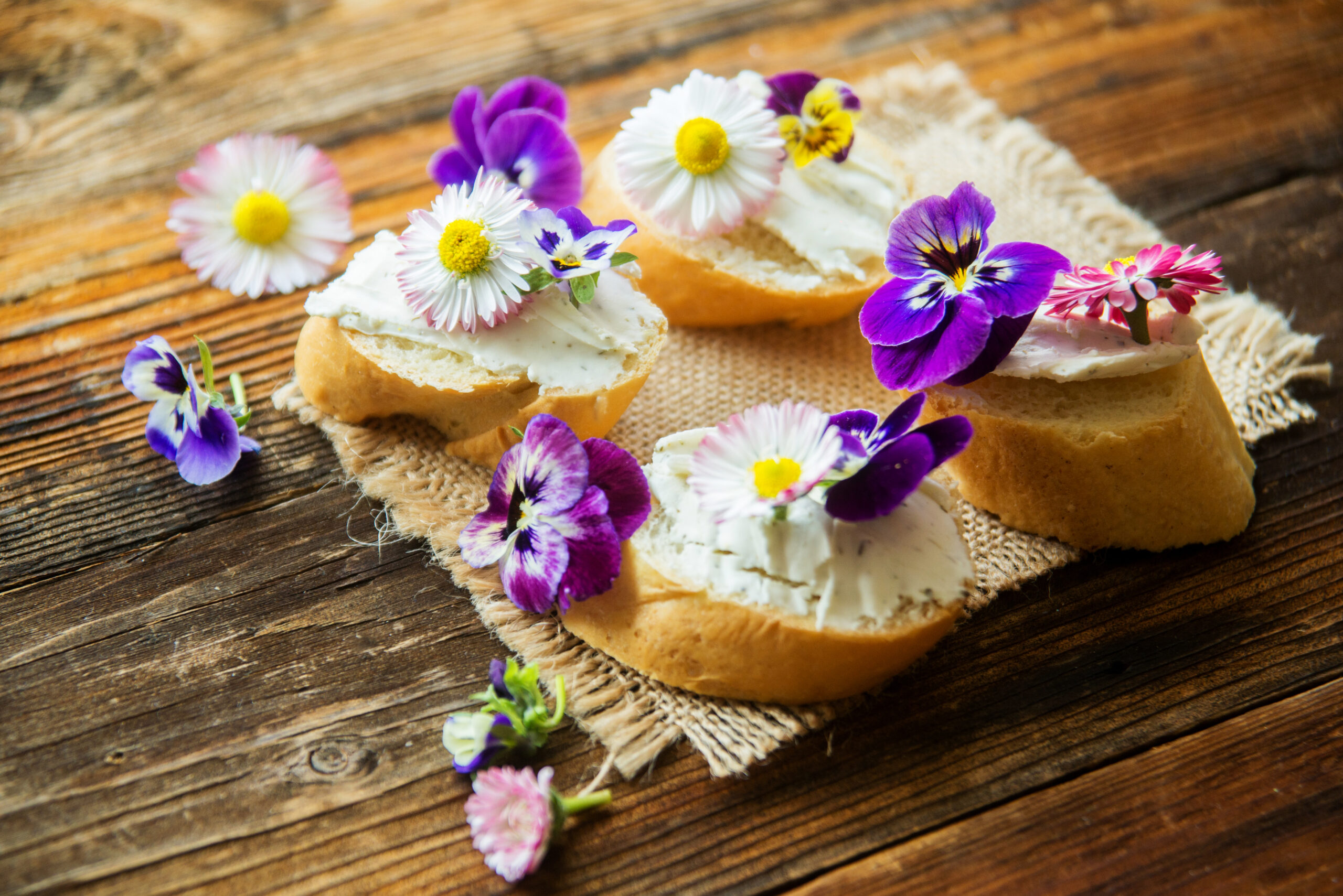 - Spread some cream cheese mixture on each slice of cooled bread. Garnish with edible flowers and snipped mint and dill sprigs.